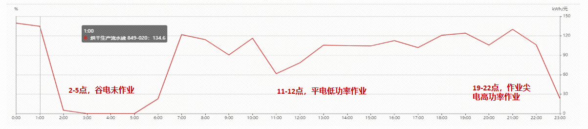 在設(shè)備數(shù)據(jù)、能耗數(shù)據(jù)透明化的基礎(chǔ)上,借助平臺(tái)數(shù)據(jù)分析,在重點(diǎn)能耗產(chǎn)線,銀輪力推“避峰就谷”的作業(yè)方式。避峰就谷就是不改變作業(yè)時(shí)間的基礎(chǔ)上,盡量保障優(yōu)先在谷電平點(diǎn)時(shí)間用電,如果谷電平點(diǎn)時(shí)間不足,那么就在峰電,如果峰電時(shí)間還不夠就在尖電時(shí)間用電,以此類推。