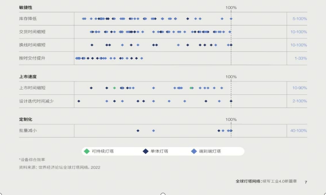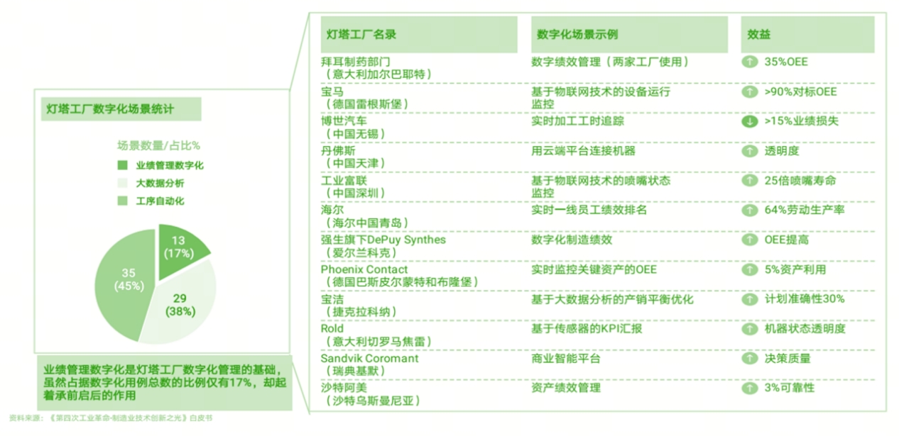 (3)可持續綠色燈塔工廠:在滿足先進技術應用以及規模化效益的基礎上,會更多地關注工廠在可持續性方面的一些技術用例和好的實踐。依托工業4.0技術,燈塔企業在運營表現和可持續性等指標上均取得了顯著成效。