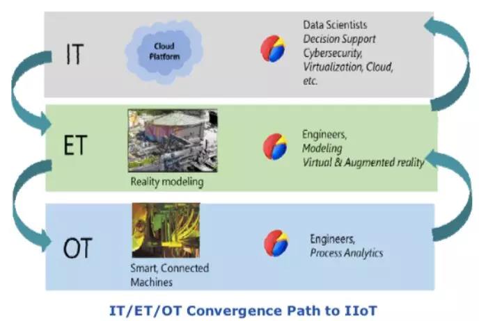在制造業中由于智能設備的復雜度增加,相應的軟件推動 IT 和 OT 緊密的集成,于是創造了在原有的知識上獲得新的洞察和觀察視角的機會。只是在 IIoT 的數字化數據環境中,將 ET 工程技術中那些為建立虛擬模型的技術納入 OT-IT 融合的進程和交換中,這才能真正發揮作用。或許過去 ET 已經被隱含在 OT-IT 的融合中,但是它的作用被低估了。在現在和將來的工作環境必須改變這種觀念,原因在于建模工具已成為管理決策或技術決策中的基礎和必備的環節。