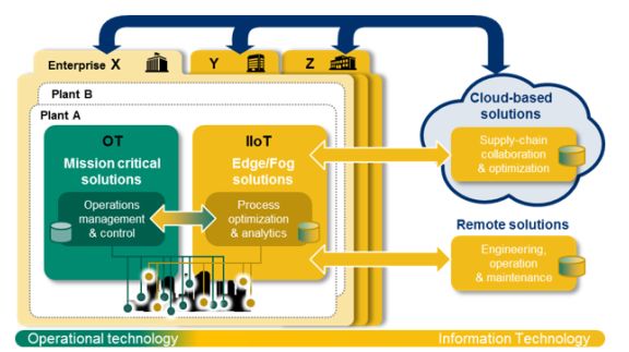 怎樣把老一輩在工廠生產管理的經驗和積累的知識, 通過數字化轉型成為“數字原生” 的知識財富, 并被年青一代繼承和發展,這一挑戰也可理解為 OT 與 IT 交匯融合,使得 OT 和 IT 各自的“神經突觸”緊 緊相連, 從而為創造更多價值提供保證。圖5 是日本橫河利用工業互聯網 IIoT 實現流程工業的 OT 和 IT 融合的解決方案。