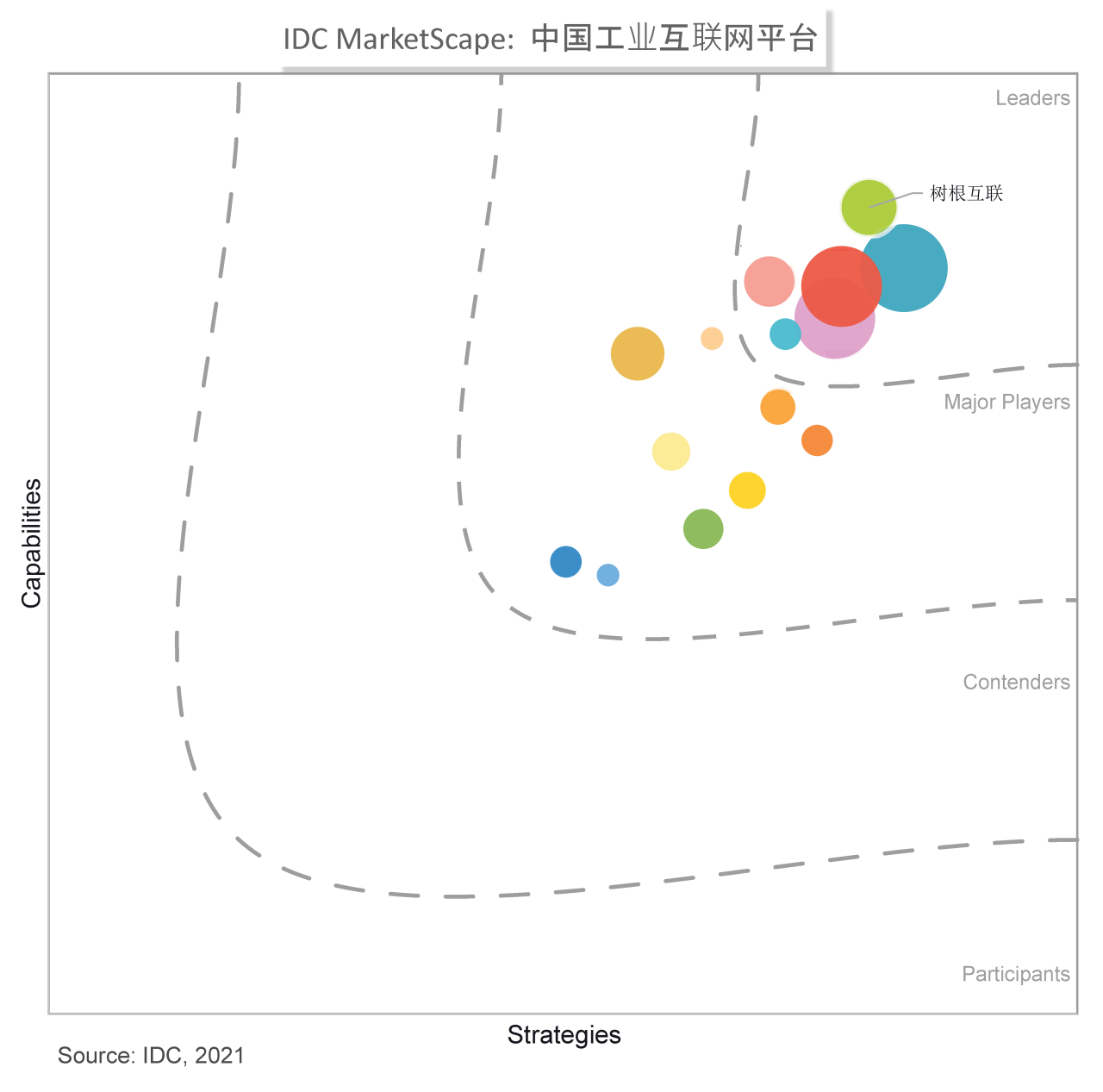 歷時半年,IDC調(diào)研了近30家相關(guān)廠商與近30家終端用戶,在全球IIoT平臺定義基礎(chǔ)上,將平臺產(chǎn)品及其解決方案共同納入本次研究范圍和評選標(biāo)準(zhǔn),從業(yè)務(wù)收入、產(chǎn)品功能、集團業(yè)務(wù)占比等多個方向做了具體界定,從若干細分維度進行評估,并分配不同的權(quán)重。 在IDC MarketScape圖中,縱軸是技術(shù)力,橫軸是戰(zhàn)略力,共有6家廠商位居Leaders區(qū)域。其中,樹根科技位于領(lǐng)導(dǎo)者象限,技術(shù)力居行業(yè)領(lǐng)先地位。 據(jù)IDC報告中的信息顯示,樹根科技的根云平臺其優(yōu)勢為市場認(rèn)知度高、設(shè)備接入能力強、持續(xù)經(jīng)營能力相對較好,以及裝備后市場服務(wù)領(lǐng)域積累豐富。具體情況為: