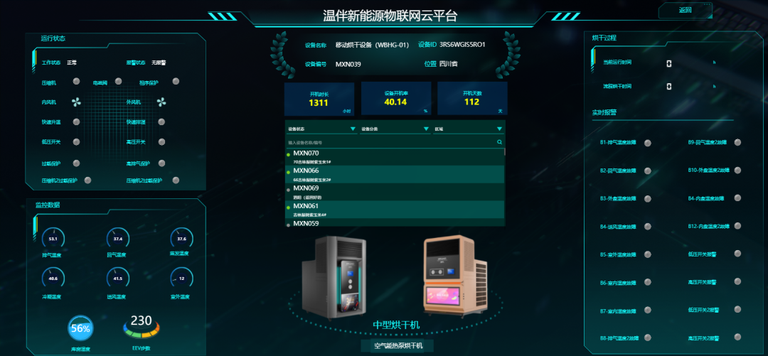 經過安裝調試,村民可以通過設備控制面板或者手機APP給設備下達指令,完成紅薯等農作物的脫水,桑葚、檸檬等水果的初加工,以及臘肉臘腸的烘干流程,大大方便了生產生活。此外,通過連接平臺,村兩委可以實時監測設備情況,保障設備安全使用。