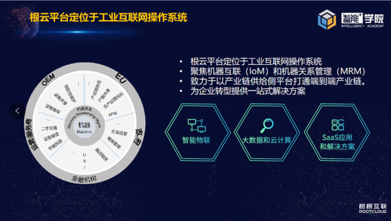 根云平臺我們定位非常簡單,兩個關(guān)鍵詞,一個叫“IOM”,我們一直把自己叫做我們是IOT平臺里面的IOM平臺,Internet of Machines,我們更多是聚焦在機(jī)器的互聯(lián),因此我們的應(yīng)用更多是叫“機(jī)器關(guān)系管理”,這里是我借用了CRM這個概念,我們叫“MRM”,Machines Relationship Management,就是我們是基于以機(jī)器為核心去看它的OEM制造商,它的終端用戶,政府的監(jiān)管和管理,金融機(jī)構(gòu)對于這個設(shè)備融資,我們的運(yùn)營和服務(wù)商對它的售后服務(wù),節(jié)能改造,設(shè)備租賃,二手交易等等,這些都是以機(jī)器為核心去做的這樣一種價(jià)值的出口,這是我們根云平臺的一個定位。