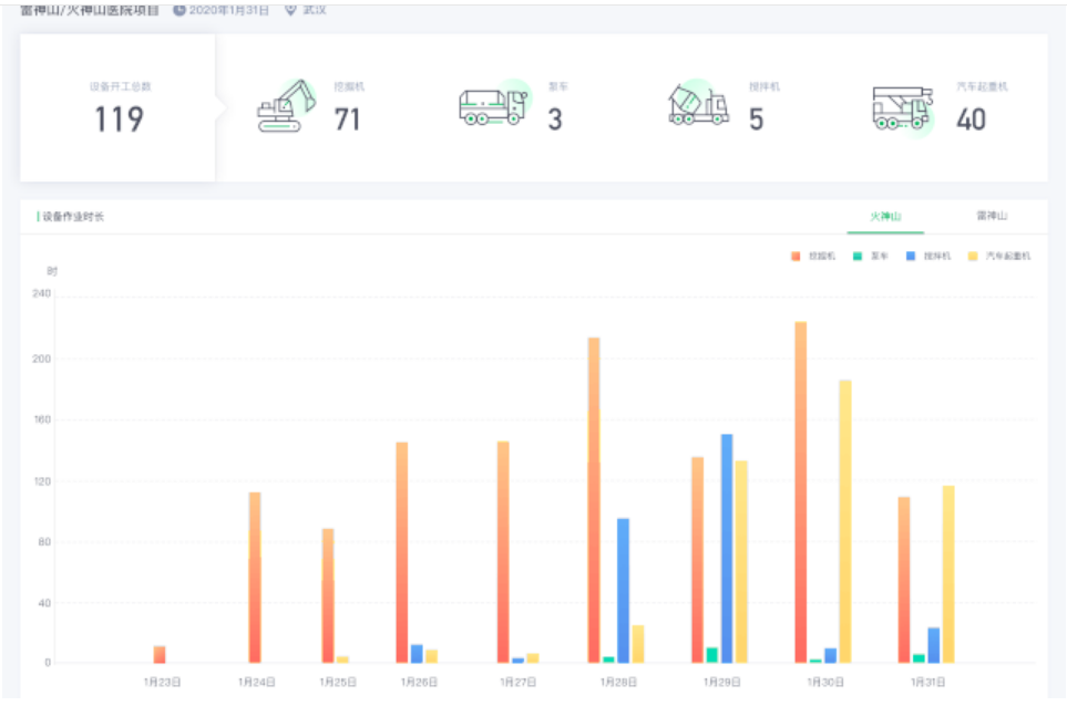 我們有一個產(chǎn)品叫應(yīng)急裝備智能管理平臺,大家看到這個界面里面,我們統(tǒng)計(jì)有400多臺在我們平臺上的設(shè)備去支援了火神山、雷神山的建設(shè),為武漢的抗疫做出了一定貢獻(xiàn),這個柱狀圖是我們每天在火神山、雷神山施工實(shí)時的情況,而且在平臺的支持下也有效彌補(bǔ)現(xiàn)場服務(wù)工程師不足的問題。