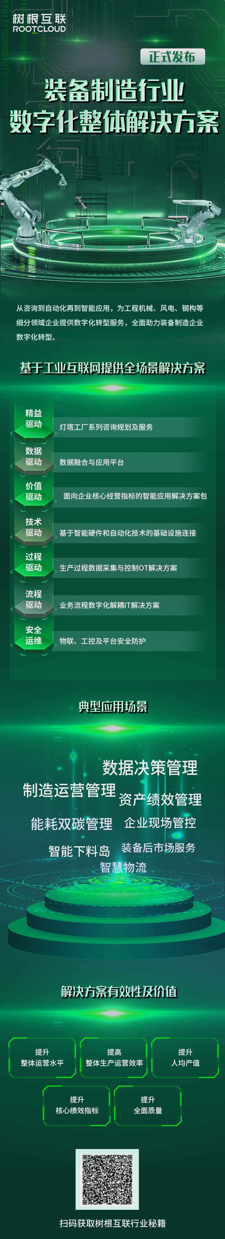 樹根科技推出以價值和數據為驅動的裝備制造行業(yè)整體解決方案。該解決方案以根云平臺為基座,實現從咨詢到自動化再到智能應用的落地:以裝備行業(yè)高價值工藝及其相關業(yè)務場景為切入點,基于根云平臺數據接入、融合計算與應用賦能的能力,通過工業(yè)互聯(lián)網引入高價值場景解決方案;覆蓋了數據決策管理、制造運營管理、資產績效管理、能耗雙碳管理、企業(yè)現場管控、裝備后市場服務、智能下料島、智慧物流高價值應用場景。