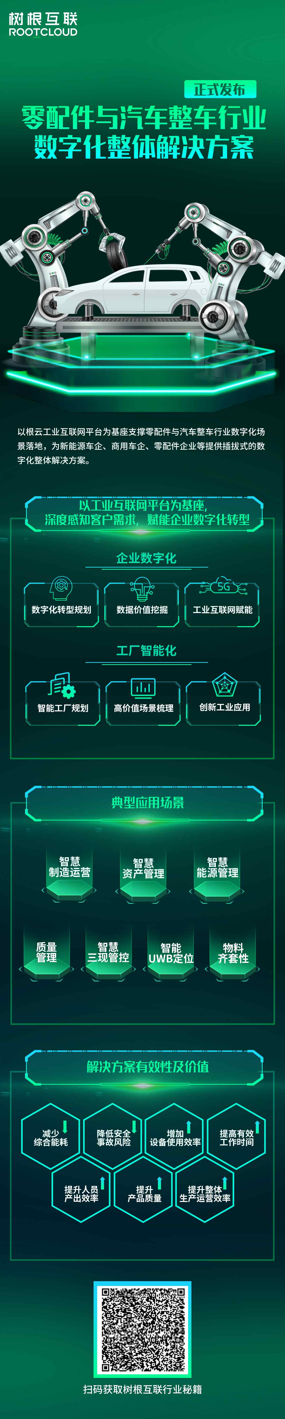 樹根科技推出的零配件與汽車整車行業(yè)整體解決方案,圍繞企業(yè)核心價值目標,從企業(yè)數字化工廠智能化兩個角度展開。通過企業(yè)數字化轉型規(guī)劃,幫助企業(yè)梳理構建數字化能力,挖掘數據價值,依托工業(yè)互聯(lián)網平臺賦能高價值場景的落地。與此同時,樹根與企業(yè)感同身受,從企業(yè)實際生產過程角度切入,幫助企業(yè)在能源雙碳、資產績效、制造運營、質量管理等方面實現數字洞察與智慧決策支撐,助力企業(yè)優(yōu)化資產設備綜合效益,實現節(jié)能減碳;提升產品生產效率及質量,確保準時交付、降低安全事故風險;提高數字洞察能力,加速實現工廠智能化,提升整體競爭力與抗風險能力。