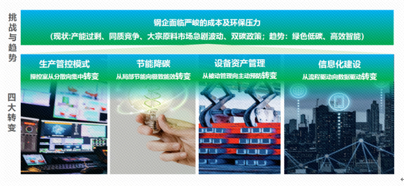 從內部智能運營角度,行業(yè)客戶正在積極融合新一代數字化技術推進四大轉變以尋求競爭力的提升:一是推進操控室從分散向集中的生產管控模式轉變;二是推進從局部節(jié)能向極致能效的節(jié)能降碳轉變;三是推進從被動管理向主動預防的設備資產管理轉變;四是推進從流程驅動向數據驅動的傳統(tǒng)IT