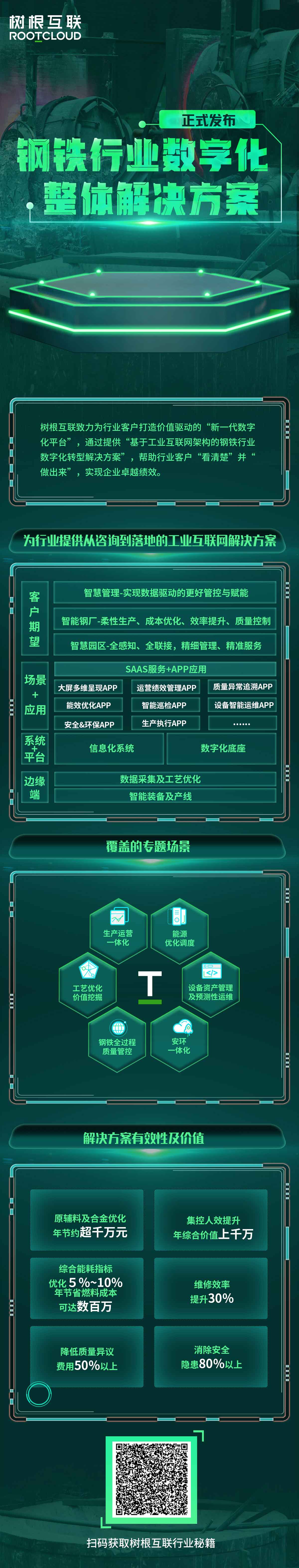 樹根科技融合鋼企信息化現狀,為行業(yè)提供從咨詢到落地的工業(yè)互聯(lián)網解決方案以打造鋼企新一代數字化平臺,助力客戶轉型成功。包括支撐實現智能鋼廠/集控中心建設的多主題數字化方案,如生產運營一體化集控中心、能源精細化管控及優(yōu)化調度、設備資產管理及預測性運維等。還包括支撐鋼鐵企業(yè)一體化管理提升的數據中臺建設方案,實現多維指標分析與異常追溯,從數據中挖掘業(yè)務價值。