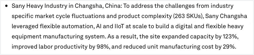 世界經(jīng)濟(jì)論壇官網(wǎng)上這樣介紹三一18號(hào)工廠的入選理由:“為應(yīng)對(duì)重工行業(yè)市場(chǎng)的周期性波動(dòng)、多品種小批量及重型部件生產(chǎn)挑戰(zhàn),三一充分利用柔性自動(dòng)化生產(chǎn)、人工智能和規(guī)模化的IIoT,建立數(shù)字化柔性的重型設(shè)備制造系統(tǒng)。最終實(shí)現(xiàn)工廠產(chǎn)能擴(kuò)大123%,生產(chǎn)率提高98%,單位制造成本降低29%”。