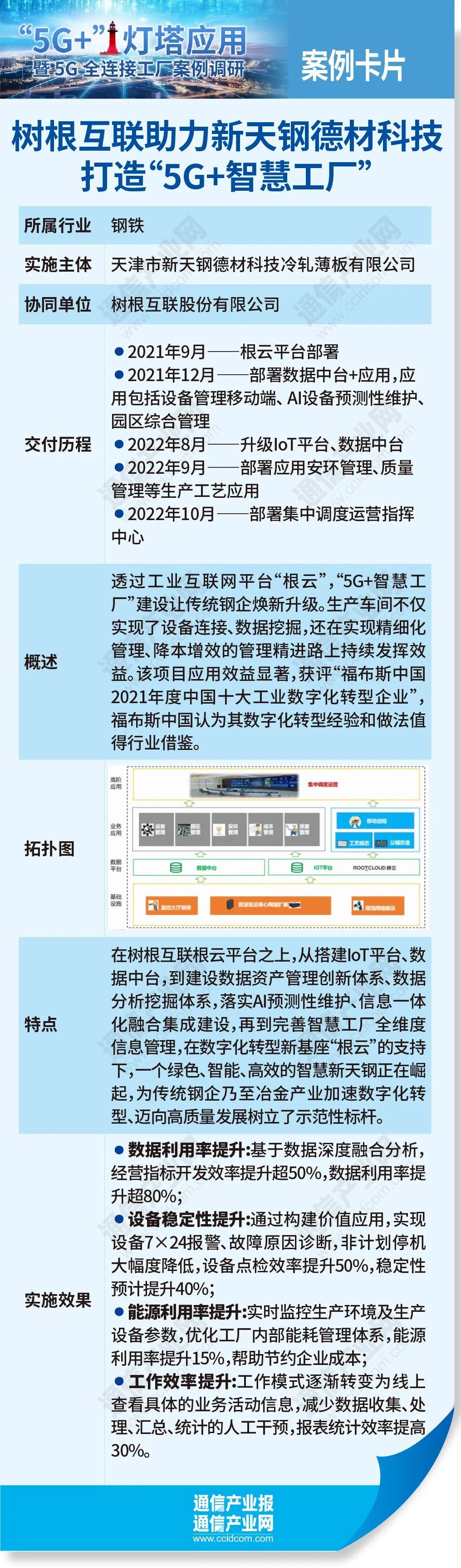 天津市新天鋼德材科技冷軋薄板有限公司副總經(jīng)理王耀東在接受《通信產(chǎn)業(yè)報》全媒體記者采訪時表示,基于5G全連接,新天鋼德材科技冷軋薄板公司需要建設(shè)智慧園區(qū)項(xiàng)目,我們攜手樹根科技合作“5G+智慧工廠”項(xiàng)目,聯(lián)合組建“5G+智慧工廠”工作室。透過工業(yè)互聯(lián)網(wǎng)平臺“根云”,“5G+智慧工廠”建設(shè)讓傳統(tǒng)鋼企煥新升級。生產(chǎn)車間不僅實(shí)現(xiàn)了設(shè)備連接、數(shù)據(jù)挖掘,還在實(shí)現(xiàn)精細(xì)化管理、降本增效的管理精進(jìn)路上持續(xù)發(fā)揮效益。該項(xiàng)目應(yīng)用效益顯著,獲評“福布斯中國2021年度中國十大工業(yè)數(shù)字化轉(zhuǎn)型企業(yè)”,福布斯中國認(rèn)為其數(shù)字化轉(zhuǎn)型經(jīng)驗(yàn)和做法值得行業(yè)借鑒。