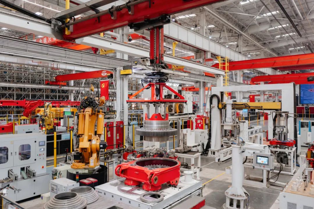 這樣的“鋼鐵巨象”是咋制造出來(lái)的?記者走進(jìn)一個(gè)制造車間,只見(jiàn)三四層樓高的車間內(nèi),生產(chǎn)線上各式機(jī)器人整齊排列,正在忙碌工作。在焊接線上,幾臺(tái)配備自動(dòng)焊槍的機(jī)器人,正在焊接一根20多米長(zhǎng)的鉆桿:藍(lán)色弧光追逐著紅外線靶點(diǎn)和軌跡,夾雜著脈沖般“吱吱”作響的焊接聲……記者仔細(xì)尋找,終于在眾多機(jī)器人間發(fā)現(xiàn)幾名工人。與人們印象中揮汗如雨的形象不同,工人們現(xiàn)在更像是在“照看”機(jī)器人,督促其認(rèn)真工作。