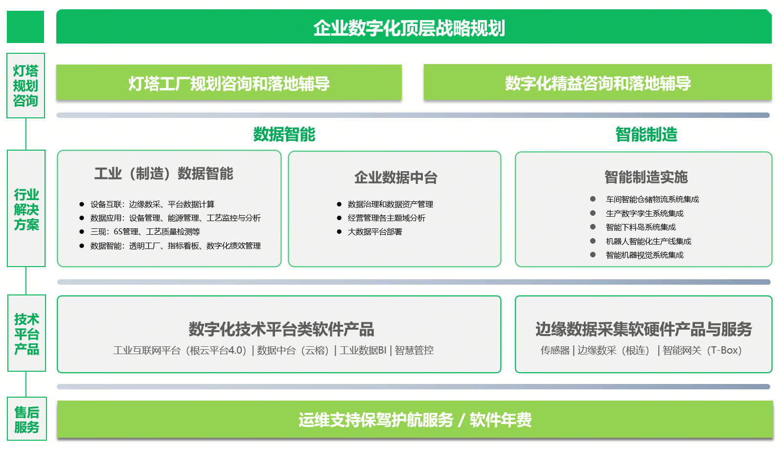 面向泛裝備行業的增效、降本、提質等核心訴求,圍繞工業互聯網、數字化、智能化、自動化、信息化的深度融合,以智能制造和燈塔工廠為切入點,提供從整體規劃到實施落地的整體解決方案