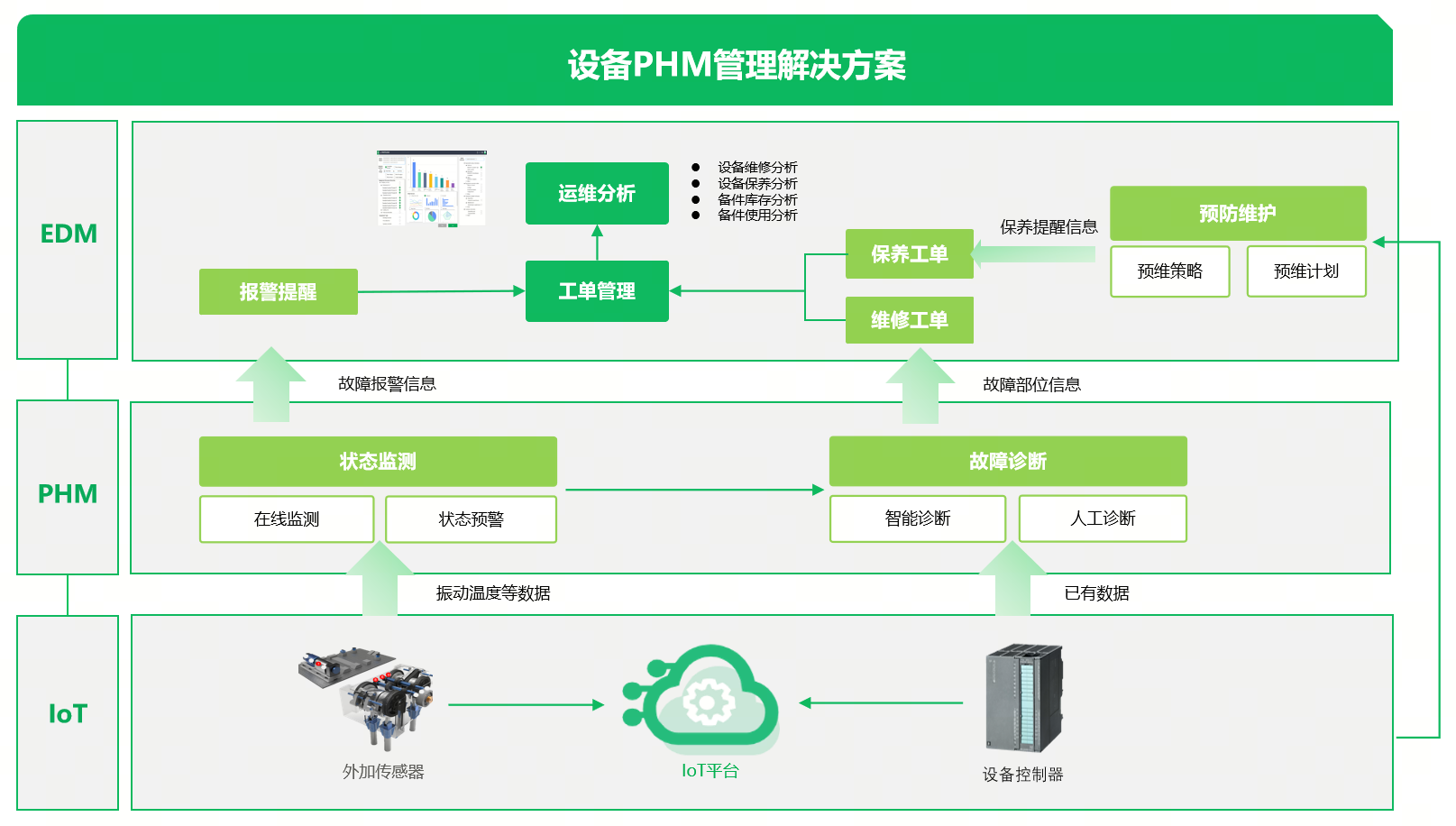 基于IoT平臺采集設備的運行過程數據, PHM系統對沖壓車間的沖壓設備運行狀態進行分析與判斷,根據分析結果聯動EDM生成維修或保養工單,實現工單的執行、分析